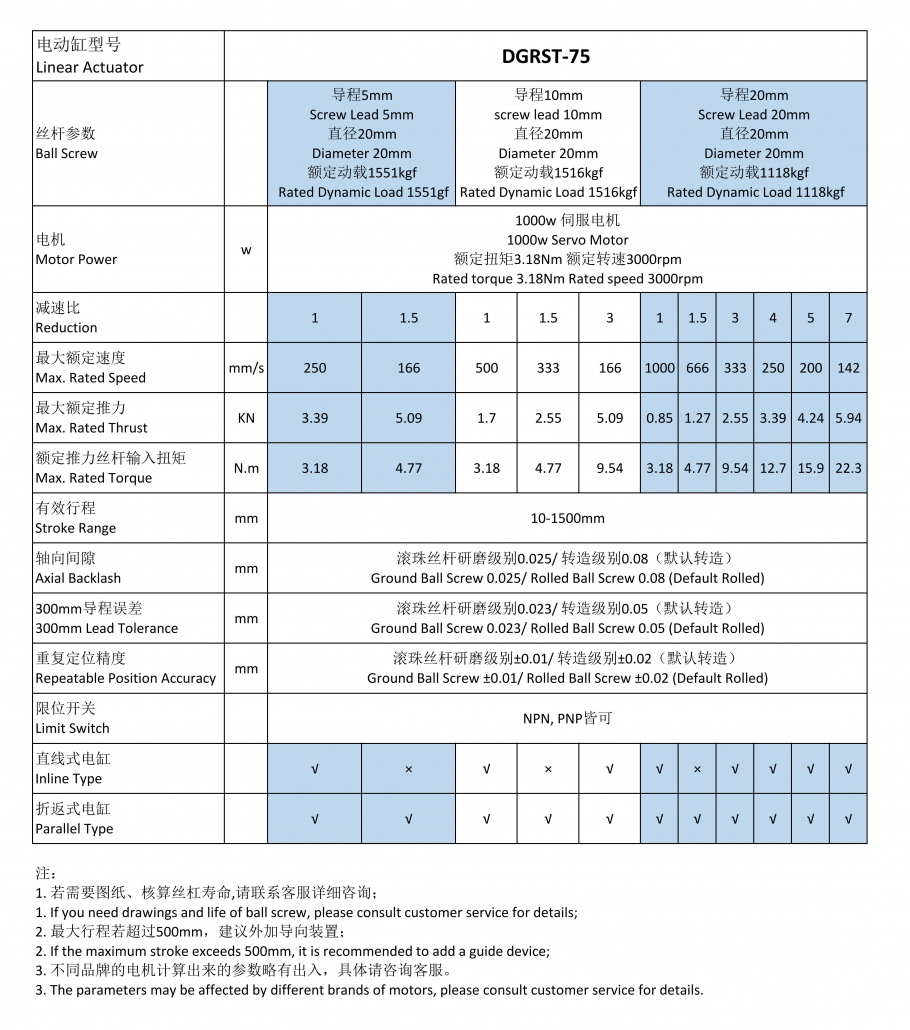 DGRST75 waterproof servo linear actuator Motor Selection List